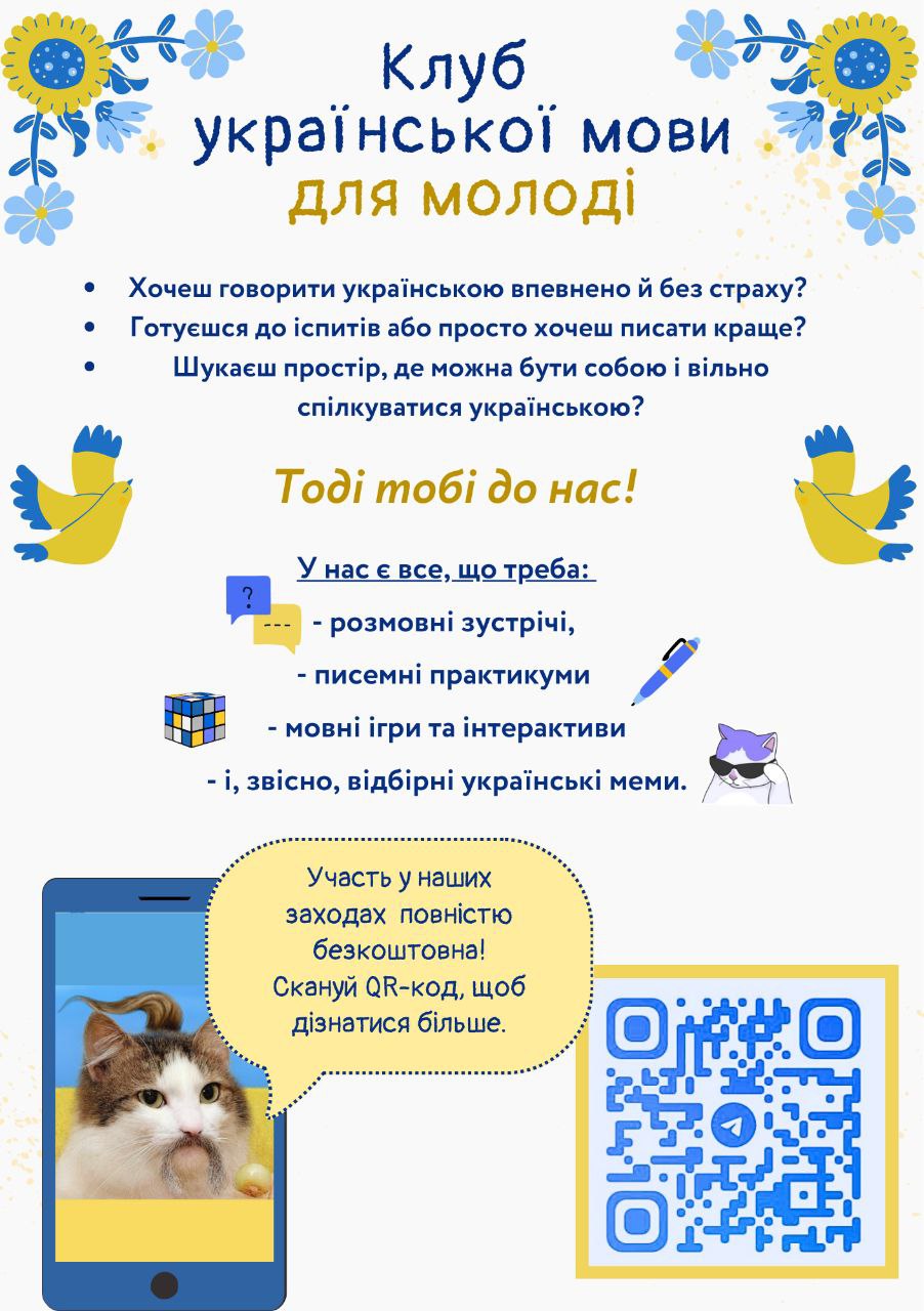 Говорити українською — це не страшно, а весело! У нашому клубі: живе спілкування, мовні ігри, меми, практикуми й тепла атмосфера.