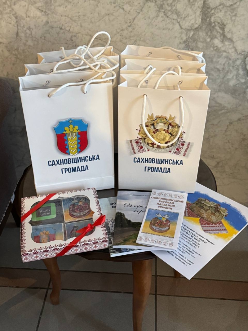 • брендовані пряники з символікою Сахновщинської громади, випечені талановитою коровайницею Ольгою Карплюк; інформаційні матеріали про громаду та Сахновщинський коровай;